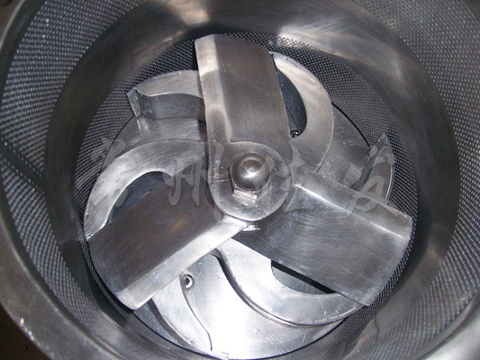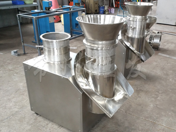 本機(jī)是通過(guò)一組旋轉(zhuǎn)碾刀,將前道工序制成的濕材注入環(huán)碾刀的不銹鋼篩筒篩孔中,從而制成圓柱狀的濕顆粒,供下道工序拋丸使用。本設(shè)備可通過(guò)更換不銹鋼篩筒來(lái)取得不同大小的顆粒。