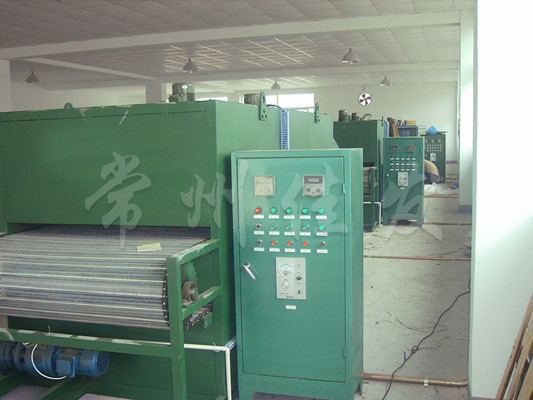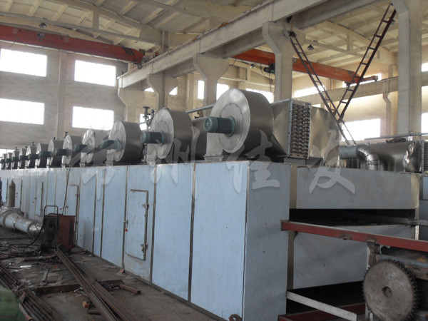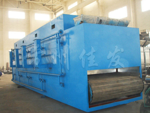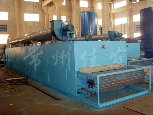 物料由加料器均勻地鋪在網(wǎng)帶上,網(wǎng)帶一般采用12-60目不銹鋼絲網(wǎng),由傳動(dòng)裝置拖動(dòng)在干燥機(jī)內(nèi)移動(dòng)。干燥機(jī)由若干單元組成,每一單元熱風(fēng)獨(dú)立循環(huán),部分尾氣由專門(mén)濕風(fēng)機(jī)排出,廢氣由調(diào)節(jié)閥控制,熱氣由下往上或由上往下穿過(guò)鋪滿物料的網(wǎng)帶完成熱量與質(zhì)量傳遞的進(jìn)程,帶走物料的水份。網(wǎng)帶緩慢移動(dòng),運(yùn)行速度可根據(jù)物料溫度自動(dòng)調(diào)節(jié),干燥后的成品連續(xù)落入收料器中。上下循環(huán)單元根據(jù)用戶需要可靈活配備,單元數(shù)量亦可根據(jù)需要選取。